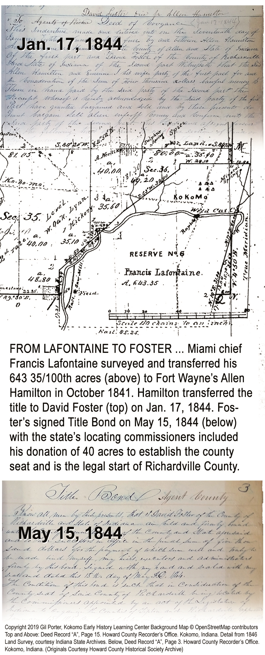 What is certain is the five locating commissioners have arrived in the reserve on Monday, May 13, 1844. Seeking a suitable site for the seat of justice, they were bound by both the Jan. 15, 1844, act creating Richardville County and the Jan. 14, 1824, act regarding “Seats of Justice in New Counties,” which states county seats are to be in a position “central and permanent.” Foster had clear title to property in the middle of the reserve (perchance arranged by Hamilton?), so they really had no choice.